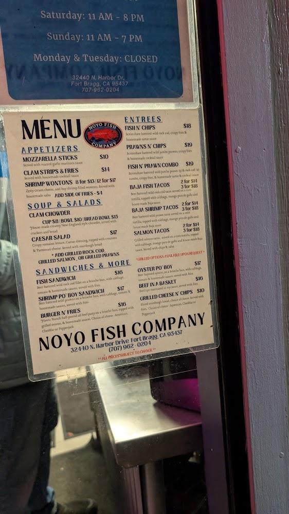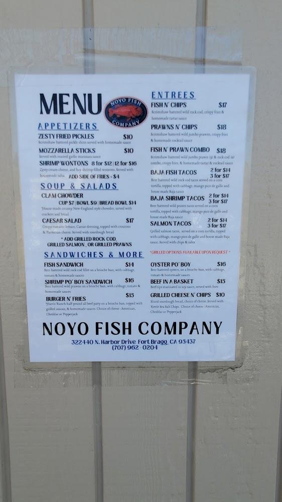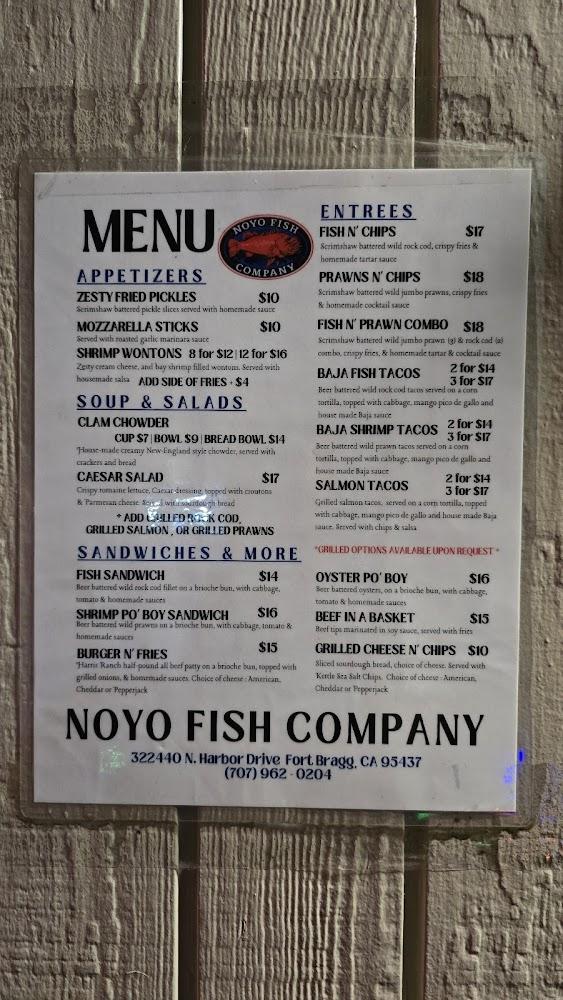 The menu at Noyo Fish Company showcases fresh seafood crafted into classic dishes. Fish N' Chips is a must-try, along with their delicious clam chowder served in a bread bowl. The tacos, whether fish or shrimp, bring a flavorful twist while providing hearty portions.